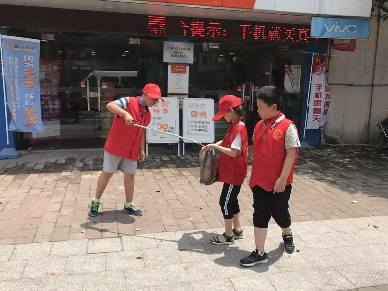 孩子们在老师的带领下身穿红马甲,头戴小红帽,有的拎着塑料垃圾桶,有的手执长长的火钳夹,有的戴上劳动专用纱手套,走上宽阔的周行街道,积极投入到了火热的捡垃圾行动中,不怕脏、不怕热、不怕累,用自己的实际行动传承着“互相帮助、助人自助、无私奉献、不求回报”的志愿者精神。