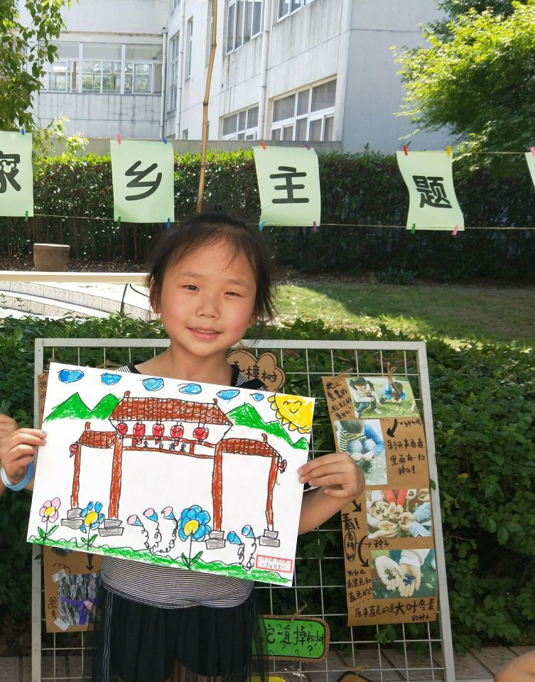 时间一分一秒地过去,孩子们陆续完成了自己的作品。中班的阳阳指着自己的画介绍说:“我画的是王庄的迎阳桥,上面有柳条飘下来。”来自盐城的中(3)班的张涵介绍说:“我画的是家乡的老房子,虽然离开家乡好久了,但我依然怀念家乡的老房子。”来自四川的中(1)班饶佳琪说:“我画的是家乡的李白故里。我长大了,也要做个大诗人。”孩子们抢着介绍自己的画作,话语间流露出对家乡的赞美和热爱。