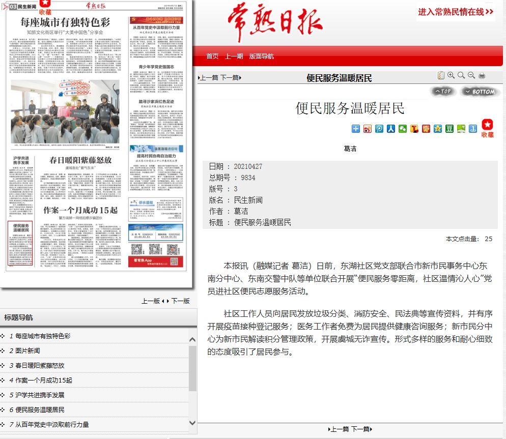 4月27日《常熟日报》报道《便民服务温暖居民》 (东南分中心)