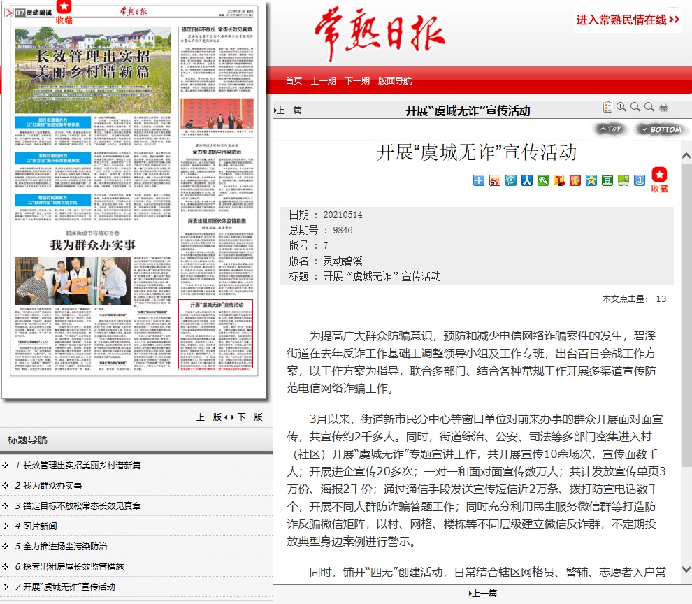 5月14日《常熟日报》报道《开展“虞城无诈”宣传活动》 (碧溪分中心)