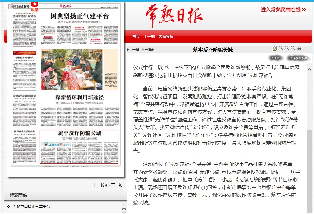 4月13日《常熟日报》报道《筑牢反诈防骗长城》 (常福分中心)